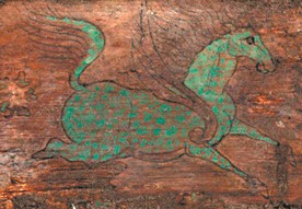 On the base of the wooden coffin are paintings of 12 auspicious beasts, including a winged lion and a celestial horse, which differ from each other but share a similar style featuring wings, wide-open mouths, elongated tongues, and four sharp claws.