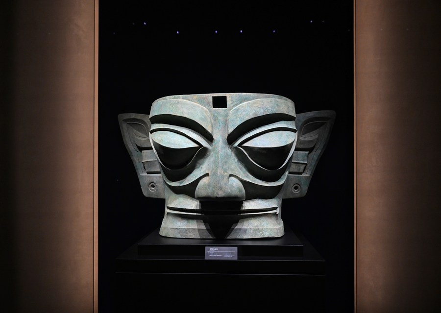 This photo taken on July 26, 2023 shows a bronze mask at the new building of the Sanxingdui Museum in Guanghan, southwest China's Sichuan Province.(Xinhua/Liu Kun)
