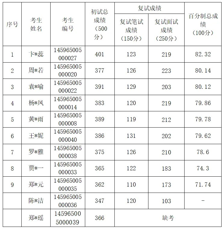注:1.百分制总成绩的构成按照学校《中国社会科学院大学2025年硕士招生复试录取工作办法》,初试成绩(满分500分)和复试成绩(满分400分)在最终成绩中的占比分别为60%和40%。