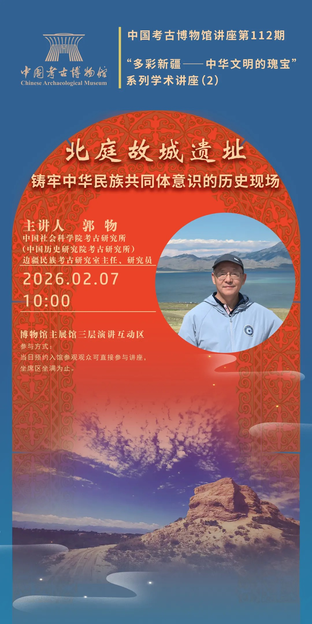 2026年1月1日,中国考古博物馆“多彩新疆——中华文明的瑰宝”专题展正式对公众开放。展览以“根脉相连”“坚定一统”“光耀北庭”“辉映于阗”四个单元,系统呈现史前至宋元明清时期新疆纳入中央政权治理体系、各民族交往交流交融的历史轨迹,生动诠释了“新疆自古属中华”的历史事实,为深化展览社会影响力、提升文化传播价值,帮助观众更系统深入地了解新疆历史文化底蕴与中华文明多元一体格局,我馆特举办同名系列学术讲座,邀请知名专家围绕新疆重要考古发现、典型遗址与珍贵文物、文化交流融合等主题展开分享,带领观众透过文物感悟中华文明的博大精深与新疆考古的独特魅力,敬请关注。