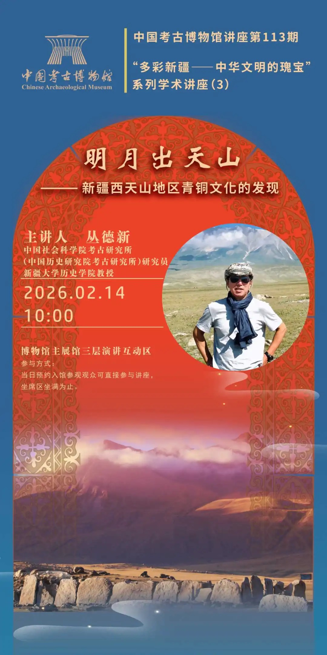 2026年1月1日,中国考古博物馆“多彩新疆——中华文明的瑰宝”专题展正式对公众开放。展览以“根脉相连”“坚定一统”“光耀北庭”“辉映于阗”四个单元,系统呈现史前至宋元明清时期新疆纳入中央政权治理体系、各民族交往交流交融的历史轨迹,生动诠释了“新疆自古属中华”的历史事实,为深化展览社会影响力、提升文化传播价值,帮助观众更系统深入地了解新疆历史文化底蕴与中华文明多元一体格局,我馆特举办同名系列学术讲座,邀请知名专家围绕新疆重要考古发现、典型遗址与珍贵文物、文化交流融合等主题展开分享,带领观众透过文物感悟中华文明的博大精深与新疆考古的独特魅力,敬请关注。