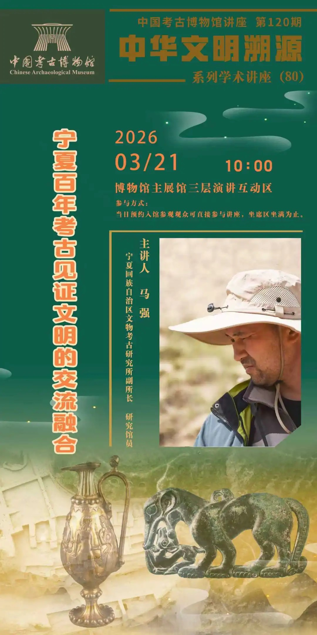 宁夏地处中原农耕文明与北方游牧文明的交汇地带,是中华文明多元一体格局形成的重要见证地。讲座以宁夏百年考古工作为线索,梳理自1923年水洞沟遗址发掘以来,宁夏地区在旧石器时代、先秦、秦汉、魏晋南北朝、隋唐等历史时期的重大考古发现。揭示宁夏在东西文化交流、民族融合、丝绸之路文明互动中的独特地位,探讨古代人群构成与迁徙融合的过程,展现考古学如何实证中华文明“多元一体、兼收并蓄、绵延不断”的深刻内涵。