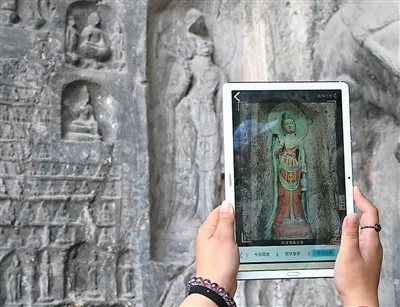 从2005年起,龙门石窟研究院开始为龙门石窟建立数字化档案,借助激光扫描等技术手段收集文物数据,以数字的形式留存千年石刻群的风貌。图为龙门石窟研究院工作人员在万佛洞前查看数字化复原后的造像。新华社记者 李嘉南摄