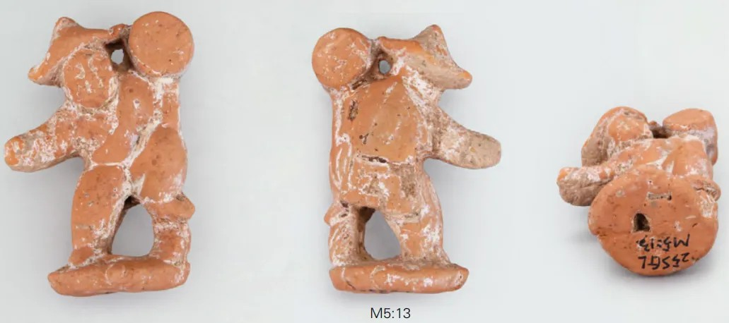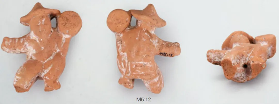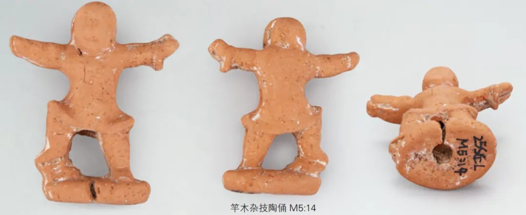 竿木杂技陶俑M5:13和M5:12形制相同,均为泥质褐陶。M5:13,通高5.8厘米,头戴尖顶圆帽(形似斗笠),面目清晰,身体微向右倾。其上身穿交领右衽短衣,下着裤装。左手托举圆柱形物体,手肘支撑于左腿。右臂张开,右手握拳。左腿屈膝踩于一物,右腿斜撑于圆形踏板。陶俑底部中间与踏板中间各有一圆形小孔,应为竿木插孔。M5:12,残高4.9厘米,面部模糊不清,左脚踩踏物残缺,右脚以下及圆形踏板亦残缺,底部中间同样有一圆形小孔,应为竿木插孔。