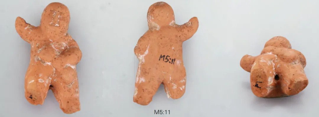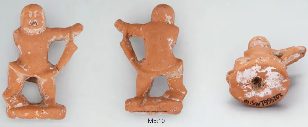 M5:11,泥质褐陶。右手、双腿下部残,残高4.9厘米。光头,面目不清。上身似穿交领右衽短衣,下着裤。右手高举,左手前屈,手握两端较大中间稍细的长条形物体。底部中间有一圆形小孔,应为竿木插孔。