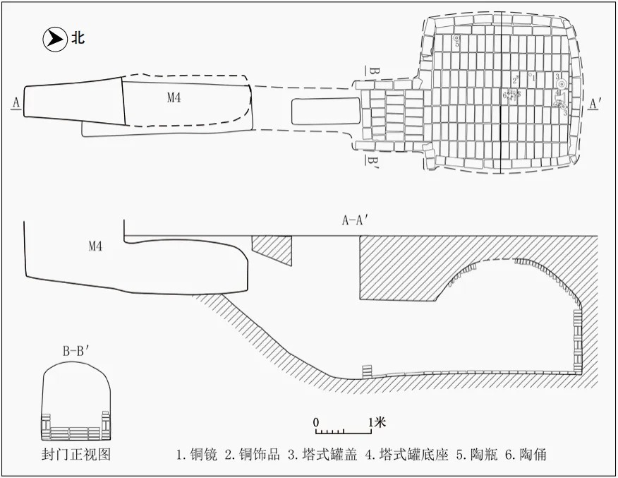 M5为斜坡墓道单天井单砖室墓。墓道被M4打破,通长9.08米,由墓道、过洞、天井、甬道和墓室5部分组成。墓道呈长方形直壁斜坡状,长3.09米,至天井中间结束。过洞为拱顶土洞式。天井长1.24米。封门用条砖平铺砌筑。拱顶式甬道,用条砖砌成,两侧以条砖错缝平砌,以四顺一丁一组、两顺一丁两组和四顺一组砌筑,东侧残存15层,西侧残存7层,底部用6列条砖南北竖向错缝平铺。墓室呈圆角弧方形,长2.99米,宽2.92米,高约2.06米。墓壁以条砖错缝平砌,砌筑方法与甬道两侧相同,共15层。顶部为砖砌穹窿顶,以条砖错缝平砌,现存21层。底部中间用条砖对缝东西横向平铺,东、西两侧均用1列条砖南北竖向平铺。因被严重盗扰,未发现葬具和人骨。该墓共出土器物24件,有铜镜1件、开元通宝6枚、残铜饰1件、陶动物俑4件、陶人物俑7件、陶瓶1件、陶塔式罐底座和盖各2件。残存的随葬品主要分布在墓室中北部,陶瓶在墓室西南角,5件竿木杂技陶俑在墓室中部。依据墓葬形制和出土器物分析,M5的年代应当不晚于唐开元年间(713—741年)。