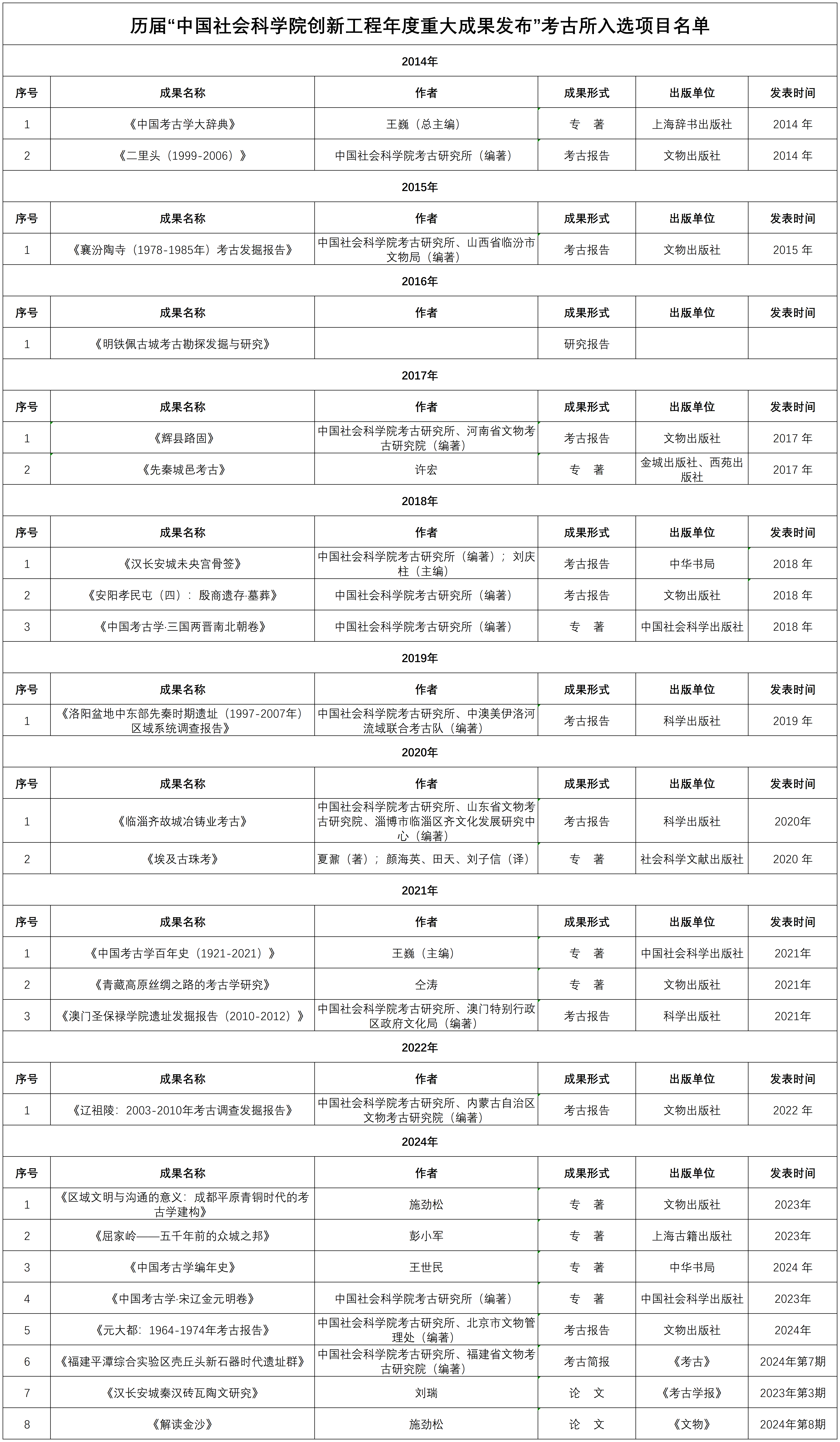 历届“中国社会科学院创新工程年度重大成果发布”考古所入选名单