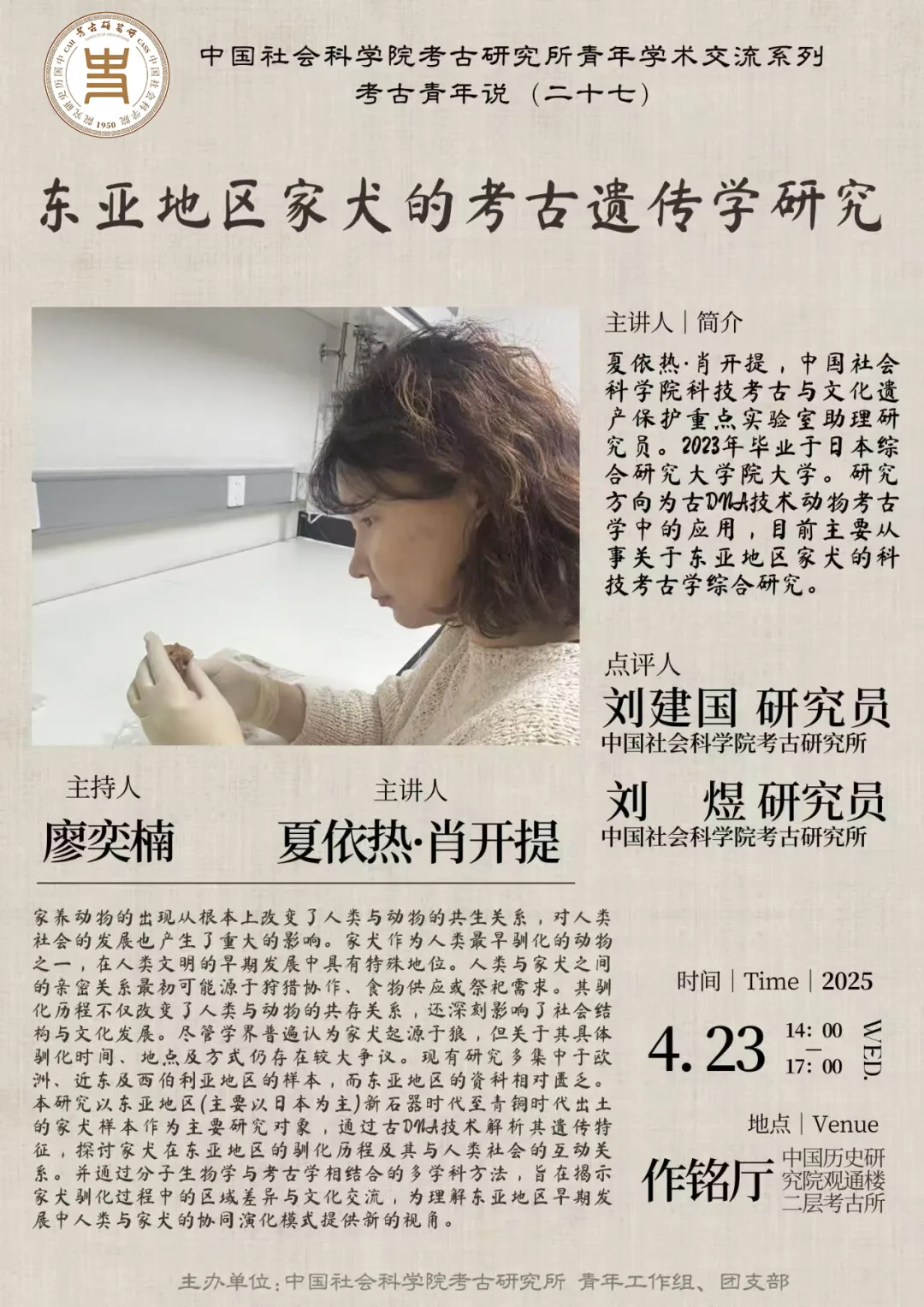 夏依热·肖开提,中国社会科学院科技考古与文化遗产保护重点实验室助理研究员。2023年毕业于日本综合研究大学院大学。研究方向为古DNA技术动物考古学中的应用,目前主要从事关于东亚地区家犬的科技考古学综合研究。