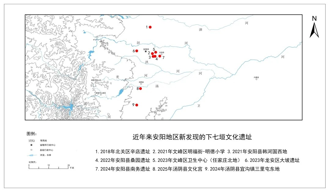 豫北安阳地区是下七垣文化分布的重要区域,历年来在北自漳河南岸,南至淇河北岸发现有30余处遗址,典型遗址有小屯西地、梅园庄、鄣邓、西高平、西蒋村、大寒南岗等。除鄣邓遗址发掘面积大、遗迹较丰富外,其余遗存面积较小、堆积较薄、内涵简单。近年来,在配合基本建设过程中,经报国家文物局批准,安阳市文物考古研究院、河南省文物考古研究院在洹河两岸、汤河南岸又先后发现9处下七垣文化遗存,其中2023年文峰区公共卫生中心(任家庄北地)、2024年安阳县南务、2024年汤阴县宜沟镇三里屯东地三处遗址,遗迹堆积较厚、出土物较丰富、发掘面积较大。现以这三处遗址为例予以介绍。