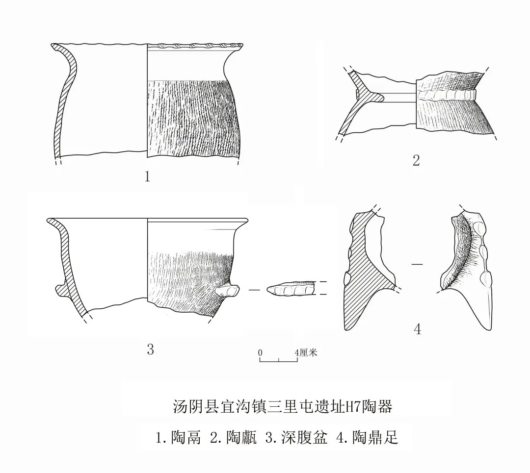 汤河以南的宜沟镇三里屯遗址的陶器以泥质、夹砂灰陶为主,大多数陶器胎体较厚,陶器也以平底器为主,但有少量底部略内凹。器形有夹砂灰陶罐、鬲、甗、鼎、深腹盆等,流行一种口沿饰绳切纹花边的深腹罐,对比任家庄北地、南务遗址典型的橄榄形深腹罐,该遗存深腹罐器形较小,体型矮胖,且绳纹略粗;有膈甗数量较多,多在腰部附加堆纹;陶鬲数量较少,形制为卷沿、有领、鼓腹、高裆,绳纹亦略粗;有少量磨光黑皮陶器,器形有深腹陶盆、大口尊、圈足盘、豆等。其中捏沿罐、圈足盘、鸡冠耳深腹盆、花边缘鼎足等不见于任家庄北地、南务遗址,而与鹤壁刘庄墓地、宋窑遗址同类陶器更为相似,其主体文化面貌应为下七垣文化辉卫型。然其分期与年代尚待进一步细致的类型学分析判断。