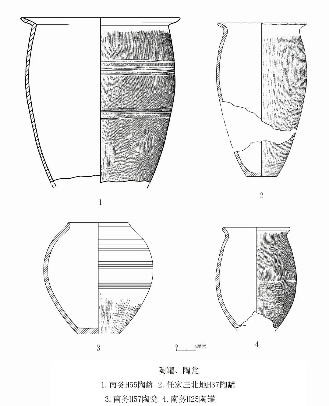 三处遗址出土的陶器器形多样,均为生活陶容器。洹河南岸的任家庄北地、南务遗址出土陶器的种类、器形、纹饰较为一致。器形主要有夹细砂陶鬲、甑、甗、深腹罐,其中薄胎细绳纹器比例较高;泥质灰陶蛋形瓮、平口瓮、小口瓮、鼓腹罐等,胎体较厚,饰以绳纹或弦断绳纹;素面磨光黑皮深弧腹盆、器盖、豆等,其上又间施以弦纹,个别上面还有楔形点纹、指甲纹、圆圈纹等,陶豆均为素面。罐、瓮类陶器均为平底器。其中,薄胎卷沿细绳纹鬲,矮领或无领,上腹斜直,下腹微鼓,锥状实足,器表施以整齐的细绳纹,绳纹下缘滚压至实足根上端,足根素面;橄榄形深腹平底罐,体型高大、瘦长。这些陶器的风格与下七垣文化漳河型一致。
