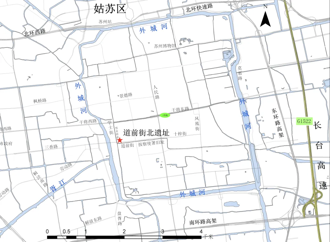 道前街北遗址位于苏州古城的西南部、剪金桥巷的东侧、道前街的北侧(图一)。2024年9月至2025年1月,为配合基本建设,报经国家文物局批准,苏州市考古研究所对道前街北遗址(姑苏区道前街210-226号)进行考古发掘,发掘面积为1500平方米,发现了近1000个遗迹单位,出土文物千余件。鉴于地下文物埋藏较为丰富,江苏省文物局专家组要求在该地块的南部以及西部区域补充发掘。2025年6月,报经国家文物局批准,苏州市考古研究所在该遗址展开第二次发掘工作,发掘面积为1500平方米(图二)。2025年又发现了从春秋晚期到民国时期的大量文化遗存,遗迹单位1289个,各类文物共2700余件。