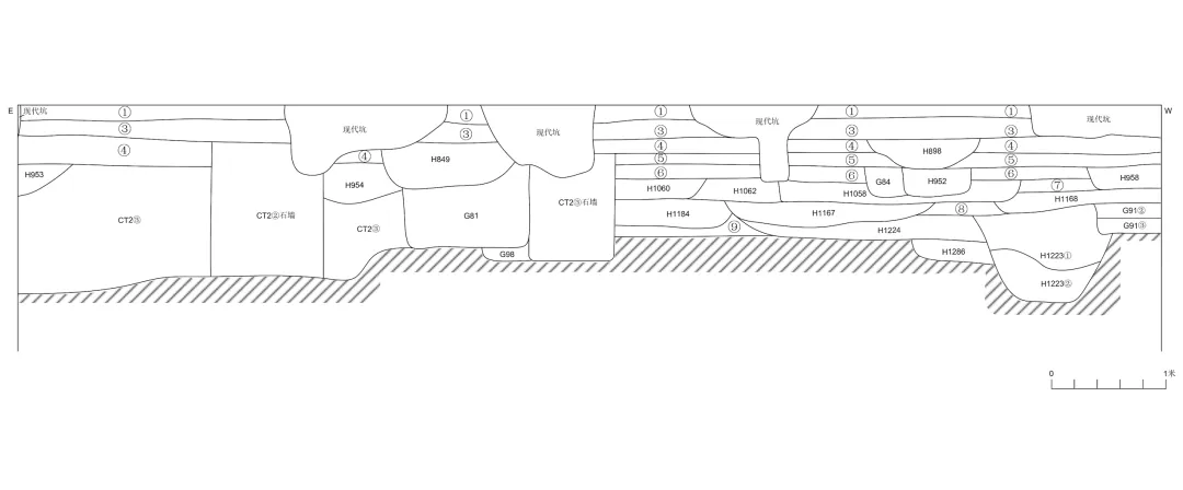 CT①层,平面为长方形,口大底小,壁倾斜,底部较平,长19.4、宽6.6-11.2、深1.2-1.5米,底部较平。根据包含物,为南宋、元代堆积。