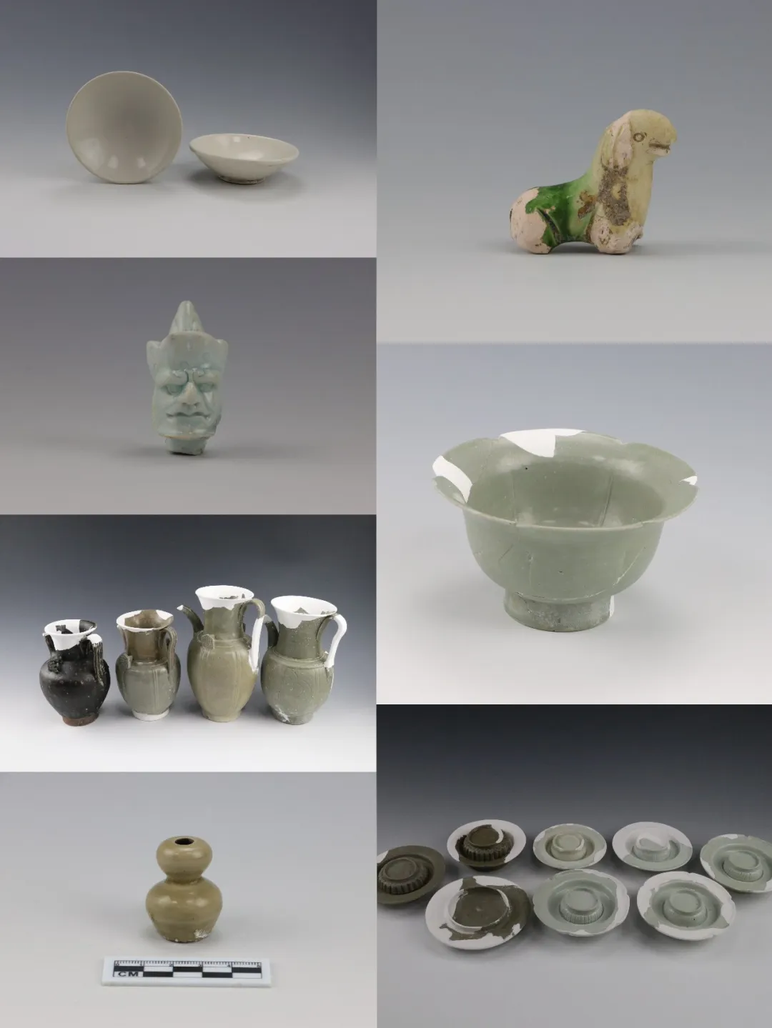 瓷器以两晋、唐、宋、元、明、清时期为主。主要窑口有邢窑、越窑、定窑、邢窑、湖田窑、龙泉窑、洪州窑、婺州窑、长沙窑、建窑、德清窑、磁州窑等。器形有碗、花口碟、盒、执壶、高足杯、炉、砚、洗、碾轮、灯盘、盏、盏托、杯、罐、瓶、葫芦形小瓶、鸡首壶、枕、玩具、塑像等(图一三~图一九)。