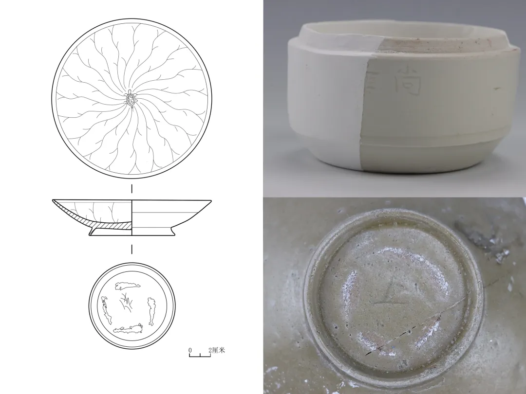 青釉“供”字款龟纹盘(2025SGDT1010CT2③:27),残。敞口,薄圆唇外撇,曲腹。平底微凸,矮圈足下张。浅灰褐胎,胎质细腻。体施青釉,釉色匀净。内壁口沿下方饰一周浅细弦纹,弦纹下饰龟荷纹,似小龟嬉戏于荷叶间。外壁口沿下方饰一周浅细弦纹。外底心刻划“供”字。青釉“上”字款大斗笠碗(2025SGDT1010CT2③:56),残。敞口,薄圆唇,斜直腹。圜底,矮圈足。浅灰褐胎,胎体轻薄。通体施青釉,釉层匀净。内壁口沿下方饰两周浅细弦纹,弦纹内饰带状三叶纹。内底划花喜鹊三缠枝梅花纹。外底心刻划“上”字。