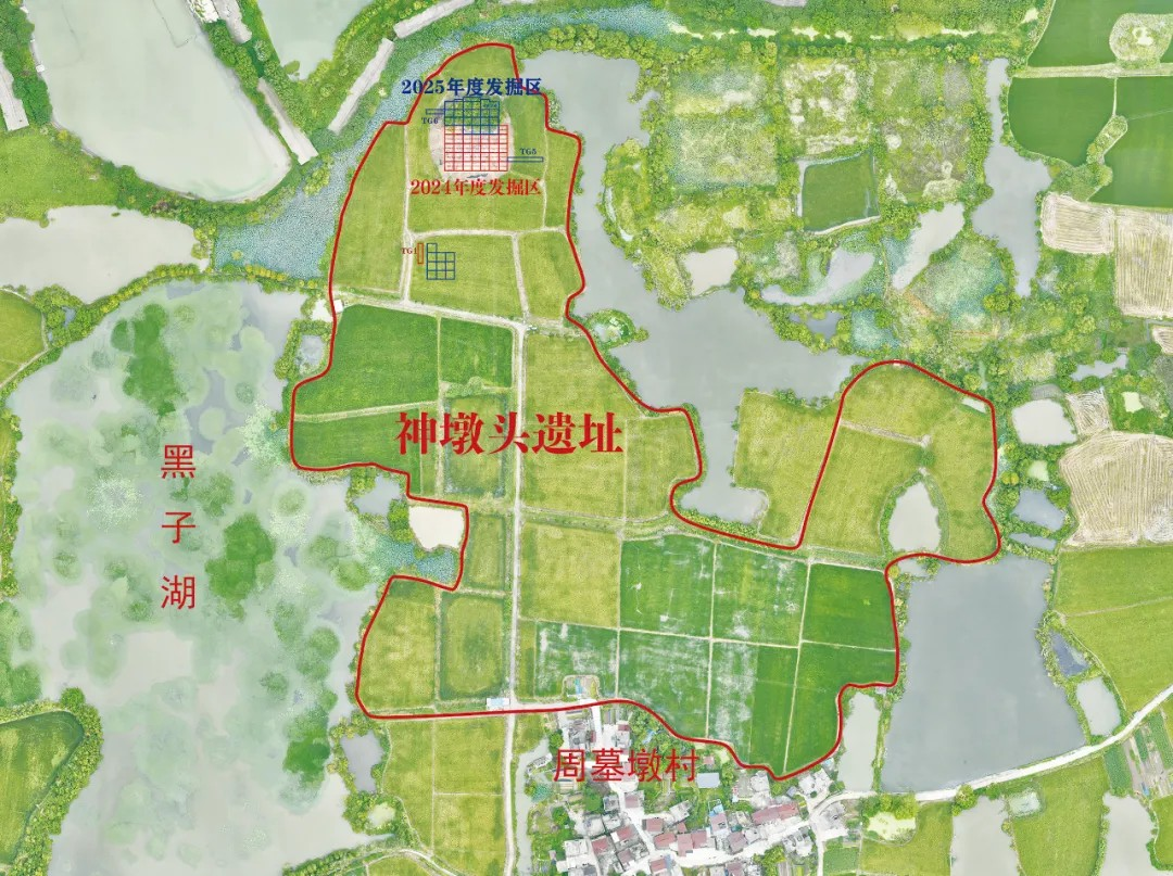 神墩头遗址位于安徽芜湖繁昌区平铺镇郭仁村,面积约8万平方米,周边有全国重点文物保护单位万牛墩土墩墓群。遗址地处漳河西岸,平面略呈“凹”字形,西北有一高出四周约2米的台地。2024年、2025年,为开展本科田野考古实习,在安徽省文物局的组织指导下,南京师范大学联合安徽省文物考古研究所、芜湖市文物考古研究所、芜湖市繁昌区文物保护中心对该遗址先后进行两次考古发掘,揭露面积1640平方米。考古发掘分北、南两个区域。北区位于遗址西北台地,南区位于台地南侧稻田。