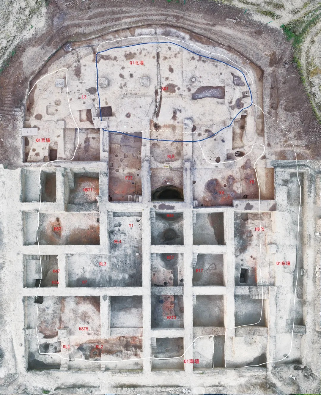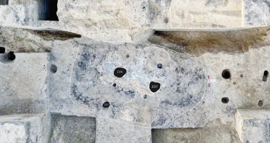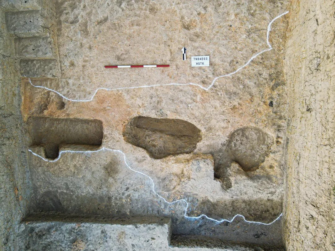 北区发现的西周早中期聚落遗迹,主要有房址9座、道路1条、水井1口。其中F31由7个柱洞围合构成,局部尚存红烧土活动面,东西宽6.68米、南北长4.48米,其内外发现大量炭化谷物和秸秆遗痕,推测与粮仓相关。F31西南侧发现的道路南北向,全长约40.3米、宽1米~6.05米。水井深约4.15米,上部为圆形,下部为方形,井壁、井底尚存木质井框及底板。北区发现的春秋中晚期聚落遗迹,主要有房址4座、石排水沟1条。F1平面近椭圆形,东西长2.52米、南北宽1.86米,周围发现4个柱洞。石排水沟全长9.43米、宽0.2米~0.4米,其底板、左右侧板呈人字形,南高北低,以利于向台地外围排水。