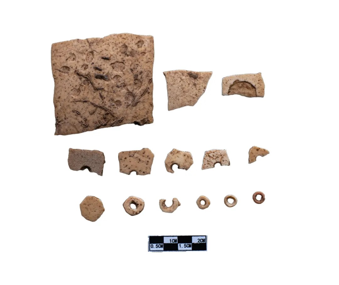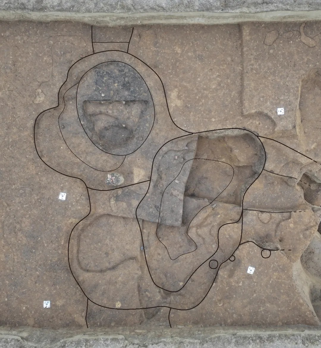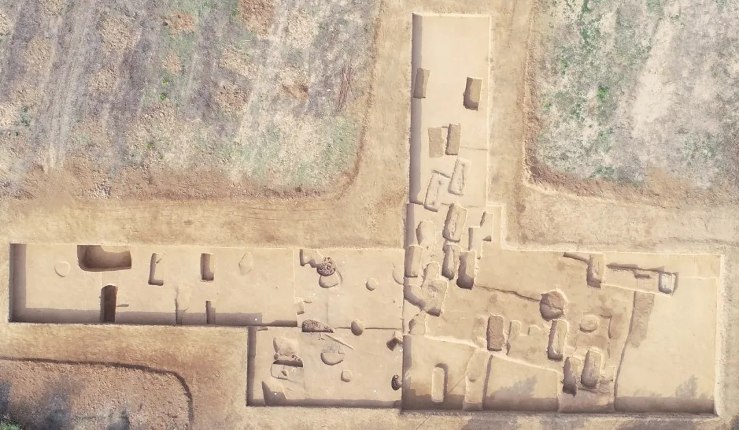 遗址中东部发现的多室建筑F1由三室组成,东室火塘保存较好,底部平整,烧土面清晰,残留炭块、陶片及石块。西室出土较多陶塑制品,房屋周边灰坑分布稀疏,显示该建筑可能具有特殊功能。遗址东南部发现红烧土柱和木骨泥墙墙面遗存,为目前所见年代最早的红烧土房屋证据之一,为研究仰韶时期红烧土建筑的起源提供了重要线索。