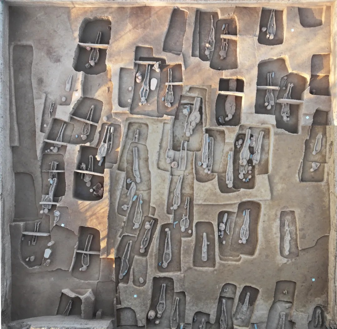 两个墓区尚未完全揭露,其空间关系仍待确认。总体葬式葬俗较为一致,竖穴土坑墓,南向,仰身直肢,陶壶多置于头西侧,已形成稳定的葬俗。西部墓葬核心区墓圹普遍较大,部分墓葬随葬品丰富,壶、深腹罐、三足钵等陶器多成组出土,另一般多见石磨盘、磨棒、陶鼎、绿松石等,反映出一定程度的社会分化。