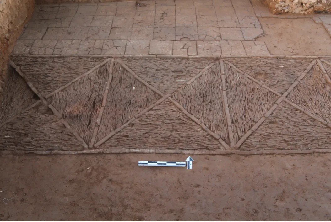 首先发现了上一年度所揭露的建筑单元的西部边缘,其西端存在一道南北向夯土隔墙,宽1.2米、残高0.3米~0.4米。沿隔墙东侧有素面方砖铺砌的地面,其北端有慢道与台基相连,慢道之上铺砌菱形纹方砖。该建筑单元新揭露区域的散水结构及其与第一期散水的叠压关系与上一年度揭露部分保持一致,针对台基的清理发现台基外立面的墙皮可以分为多层,内层墙皮之上存在网状刻划痕迹,在涂抹新墙皮时起到了加强黏合效果的作用。