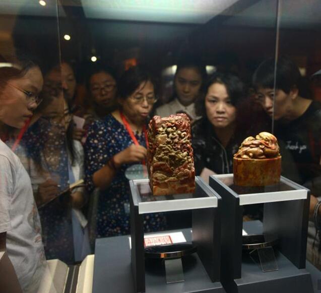 Tourists view the imperial jade seals of the Qing Dynasty (1644-1911) on display at the Fujian Museum in Fuzhou, capital of Southeast China's Fujian province, on Sept 29, 2016. The exhibition showcases nearly 100 imperial seals made of Shoushan stone from the Palace Museum in Beijing. Half of the objects have never been displayed to the public. [Photo/Chinanews.com]