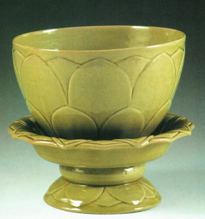 五代,1956年江苏苏州虎丘云岩寺塔出土,现藏苏州博物馆。此件器物由碗和其下的盏托组合而成,通高13.2厘米,其中碗高8.9厘米、口径13.8厘米;盏托高6.6厘米、口径14.9厘米、底径9.3厘米。碗为直口深腹,外壁饰浮雕莲花三组,盏托的形状如豆,上部为翻口盘,刻划双钩仰莲两组,下部为向外撇的圈足,饰浮雕覆状莲瓣纹。下承以莲花形托。