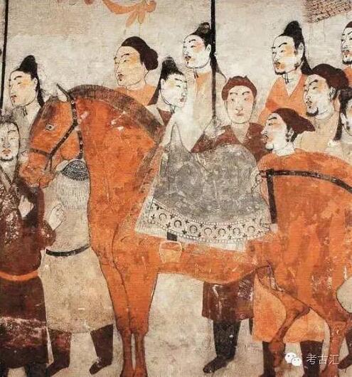 在徐显秀墓壁画中还有许多明显的外来因素,墓室西壁壁画正中为一红色骏马,挺立于人群之中。马颈下挂一缨子,为蓝色竖条纹,充满了萨珊风格,一望而知源自丝绸之路。在这匹马的鞍袱下沿有一行连珠纹人物图案,外是一圈连珠纹,内是戴花冠的人头图案。