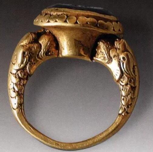 该戒指图案中人物造型与衣饰以及指环上的连珠纹、两兽首相对之形,皆非中原传统式样,显然均来自西域。