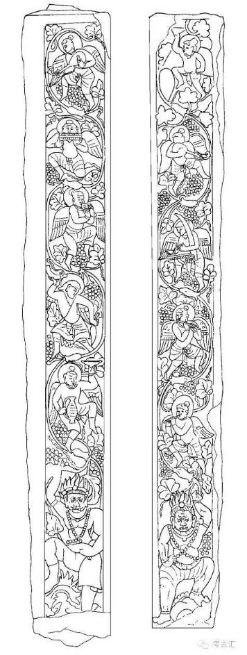 晋阳居住着很多粟特人,虞弘就是在北齐时入华来到晋阳的。太原虞弘墓、西安安伽墓、史君墓出土石葬具以及法国吉美博物馆藏安阳墓出土石葬具、日本博物馆所藏北齐石葬具图像中的许多葡萄叶蔓和成串的葡萄,既是粟特人喜爱的图案纹饰,也是北齐、北周种植葡萄的反映。虞弘墓石堂图像和甘肃天水出土石葬具图像中的酿造葡萄酒图,实际上正是当时并州和凉州粟特人生活的真实写照。