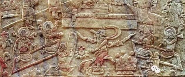 日本Miho博物馆藏北朝石床榻图像中,也有类似舞蹈一男子在中间挥臂抬腿,急速舞蹈两侧有十来个乐者,手持箜篌、琵琶、横笛、铜钹等乐器。