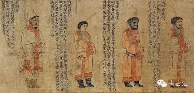 服饰是民族文化艺术的具体表现,是该民族传统生产生活方式的产物,中亚民族的服装在史书中多有记载。在撒马尔干遗存古代壁画、片治肯特2号遗址出土壁画和出土于花刺子模的托克—卡拉遗址一个盛骨瓮图像中和入华粟特人墓葬雕绘中均可见到具体服装样式图像,中亚诸国和民族之间,各自的服装也有所差异。如南朝梁元帝萧绎曾有《职贡图》,画使臣二十二人,有文有图,既有某国使臣的形象,又有该国的介绍,是非常珍贵的服饰史资料由此可见中亚诸国的服饰差异。在敦煌石窟158窟有一幅《举哀图》壁画,时代为中唐时期。该窟正面是一个释迪牟尼涅槃泥塑右边脚后绘着一幅《举哀图》,画着各国男女吊唁者粟特人居多其大同小异的服饰也可供参考。