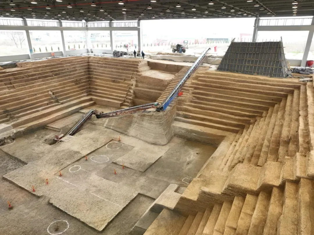 武王墩一号墓封土底部直径超过130米,墓口开口边长约51米,墓坑底部面积超过400平方米,规模巨大,是已发掘楚墓中最大的一座。封土呈现覆斗状,填土层层夯实、夯窝密集,有台阶21级,是研究战国晚期大型墓葬营建工艺的重要标本。