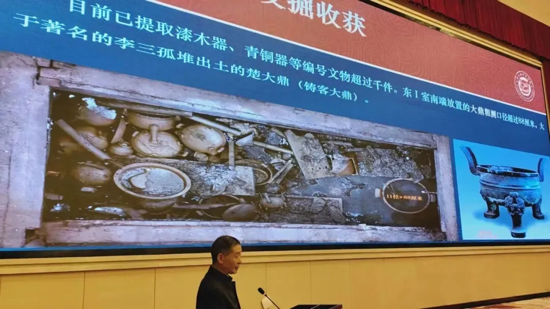 目前,已提取漆木器、青铜器等编号文物超过千件,包含青铜礼器、生活用器、漆木器、乐器、俑等珍贵文物。其中漆木器数量、种类都是空前的。东1室南端放置的大鼎粗测口径超过88厘米,大于已知最大的李三孤堆出土的楚大鼎(铸客大鼎)。