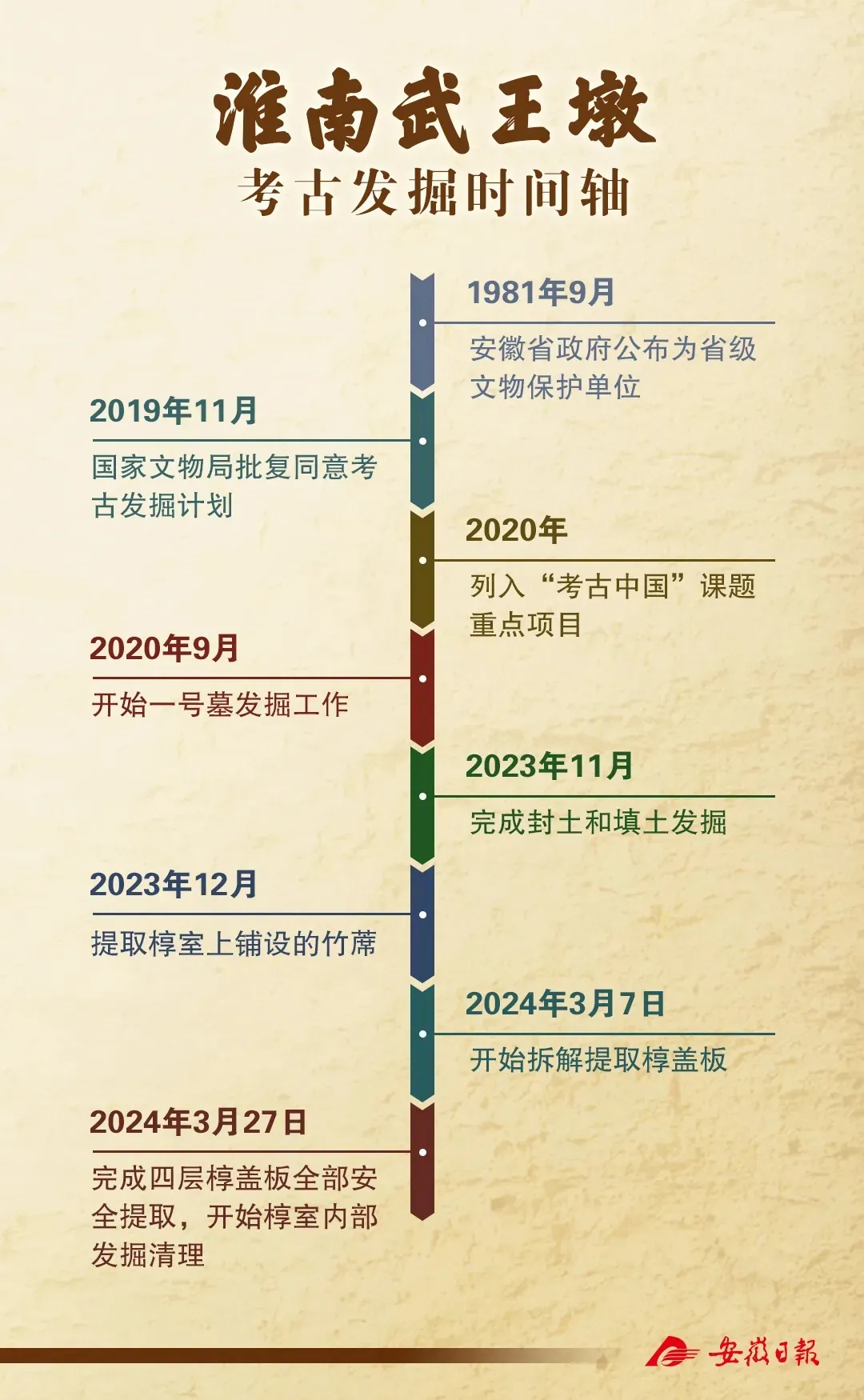 根据国家文物局批复的《武王墩一号墓椁室发掘保护工作方案》,自2024年3月7日开始拆解提取椁盖板。至3月27日,四层椁盖板已全部安全提取完成,共计443根,总重约153吨。现已进入椁室发掘第二阶段,即椁室内部的发掘清理。
