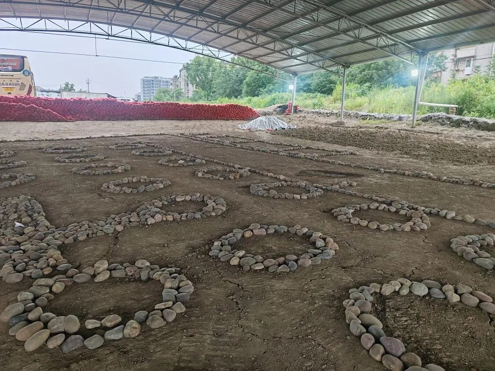 走进东塔寺遗址考古工地,记者好似走进了一个“石头阵”:有一圈圈的石头,也有横成行、纵成列的石头。东塔寺遗址考古项目负责人、浙江省文物考古研究所副所长李晖达解释说:“石头是我们用来标识的,每个圆圈下面就是一口缸,每条线下面都是木结构。”
