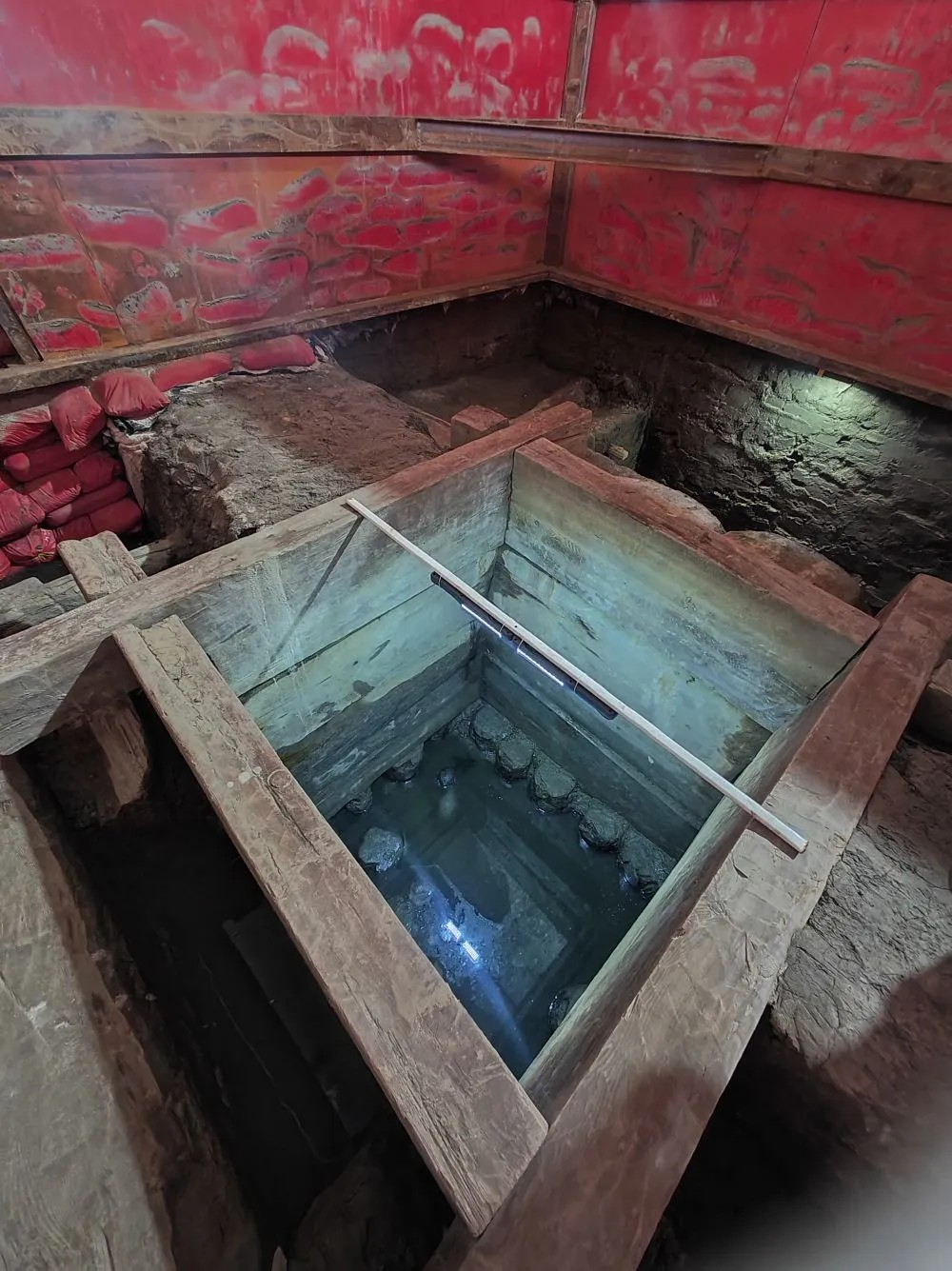 考古发现,当时的工匠建好套箱后,在箱外先铺枕木和木炭,再交叉平铺木板地梁,在地梁上放上52口大缸。在大缸外侧,工匠又用四层竖立木板分别搭建了中圈和外圈套箱。套箱之间、外箱和泥土之间都有多层桩梁加固结构。
