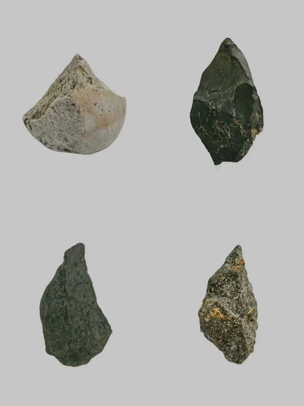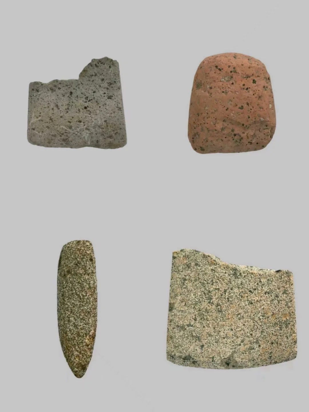 总的来看,该遗址出土石器数量较少,共出土各类石器43件,这与鄂西长江两岸的城背溪文化遗址动辄出土数千件石器形成鲜明对比。石器根据制作方法又可分为打制石器、磨制石器和天然石器三类。打制石器数量普遍器形较小,仅有1件器形略大,从质地看,有燧石、石英砂岩、硅质岩等。石器类型有小型砍砸器、刮削器、雕刻器等。磨制石器数量较少,器形有石斧、石锛等,制作较为精致,其中2件残石斧、1件石凿为花岗岩,通体磨制,体现出较成熟的制作水平。天然石器数量较少,一般为利用天然砺石直接使用,主要类型有砺石、敲砸器等。砺石可见一面有一道较深的凹槽,敲砸器多为卵石,在石器的一端往往留有敲砸使用的痕迹。