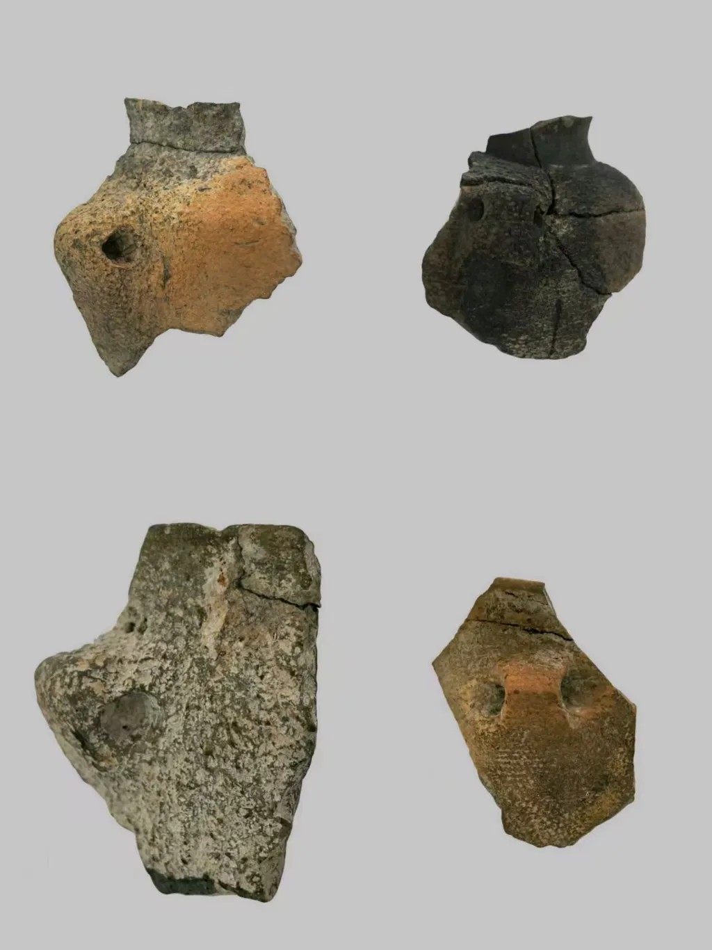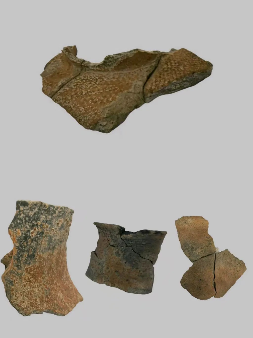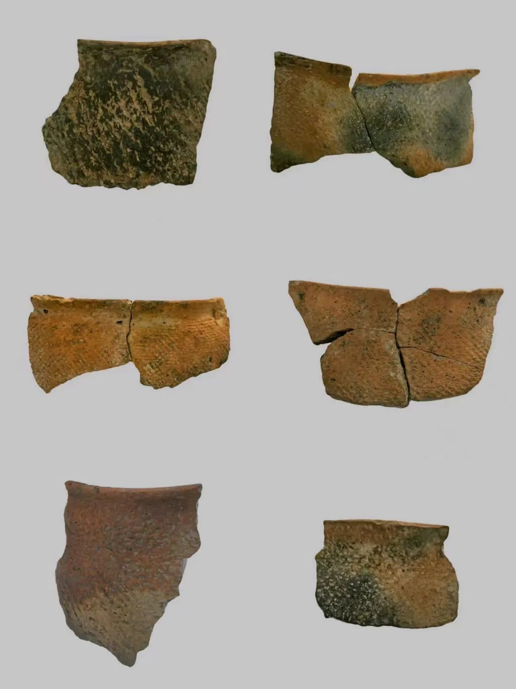 发掘揭露的遗迹较少,共发掘各类遗迹9处。其中灰坑3个、灰沟2条、陶片堆积2处、柱洞2个,以G1最为重要。根据揭露的遗迹分析,发掘区应为聚落的生活居住区。G1位于发掘区北部,规模较大,位于TN05E02、TN05E03、TN05E04、TN05E05北部,由西向东贯穿整个发掘区,两端位于探方外未发掘。灰沟开口于第⑤层下,打破第⑥层和生土层。东西长32米、南北宽约3米。由西向东逐渐加深,从沟壁和沟底的情况看,沟壁较为陡直,沟底中间深,靠近沟壁略浅。值得注意的是,G1中部(TN05E04)还保留了一个向外的生土埂,宽约1米。显然,这是一条人工开挖的壕沟,中间的生土埂属特意保留,以便通行。沟内堆积分为2层,第1层为灰黑色土,仅分布于G1东部,以生土埂为界,东部均有发现,西部未见,陶片主要出土于这一层。第2层为灰褐色粘土,土质板结致密,出土陶片较少。沟内出土陶片较多,主要集中在东部,绝大多数为夹碳陶,以红陶为主,少量灰褐陶,器表一般饰有绳纹,以粗绳纹为主。可辨器形有釜、双耳罐、长颈罐、盆、大平底盘、支座等,部分陶器可修复。