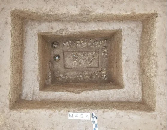 M484,竖穴土坑墓,方向 276度。平面呈长方形,长3.00、宽 2.22、深4.50米。壁面平整略有外扩,口小底大。距墓口2.82米有一周生土二层台,北宽0.24~0.30、东宽0.52~0.60、南宽0.24~0.34、西宽0.50~0.56米。葬具为一椁一棺,仅残留木痕。椁长2.46~2.48、宽1.74~1.80、高1.68米。棺长1.42、宽0.70、残高0.50米。人骨保存极差,葬式不详。墓底平铺一层河卵石,厚约0.28米。