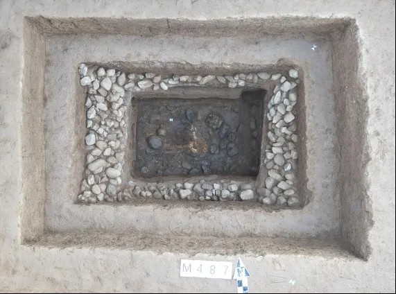 M487竖穴土坑墓,方向 288度。平面呈长方形,长3.50、宽 2.40、深4.96米。壁面平整略有外扩,口小底大。距墓口3.10米有一周生土二层台,北宽0.34、东宽0.40、南宽0.34、西宽0.38米。葬具为一椁一棺,仅残留木痕。椁与二层台间填有熟土,形成三层台,台面距二层台0.70米,西宽0.70、北宽0.14、东宽0.42、南宽0.30米,其上放置有大量河卵石。椁长1.88、宽1.46、高0.80米。棺长1.70、宽1.20、残高0.40米。人骨保存极差,葬式不详。墓底平铺一层河卵石,厚约0.16米。