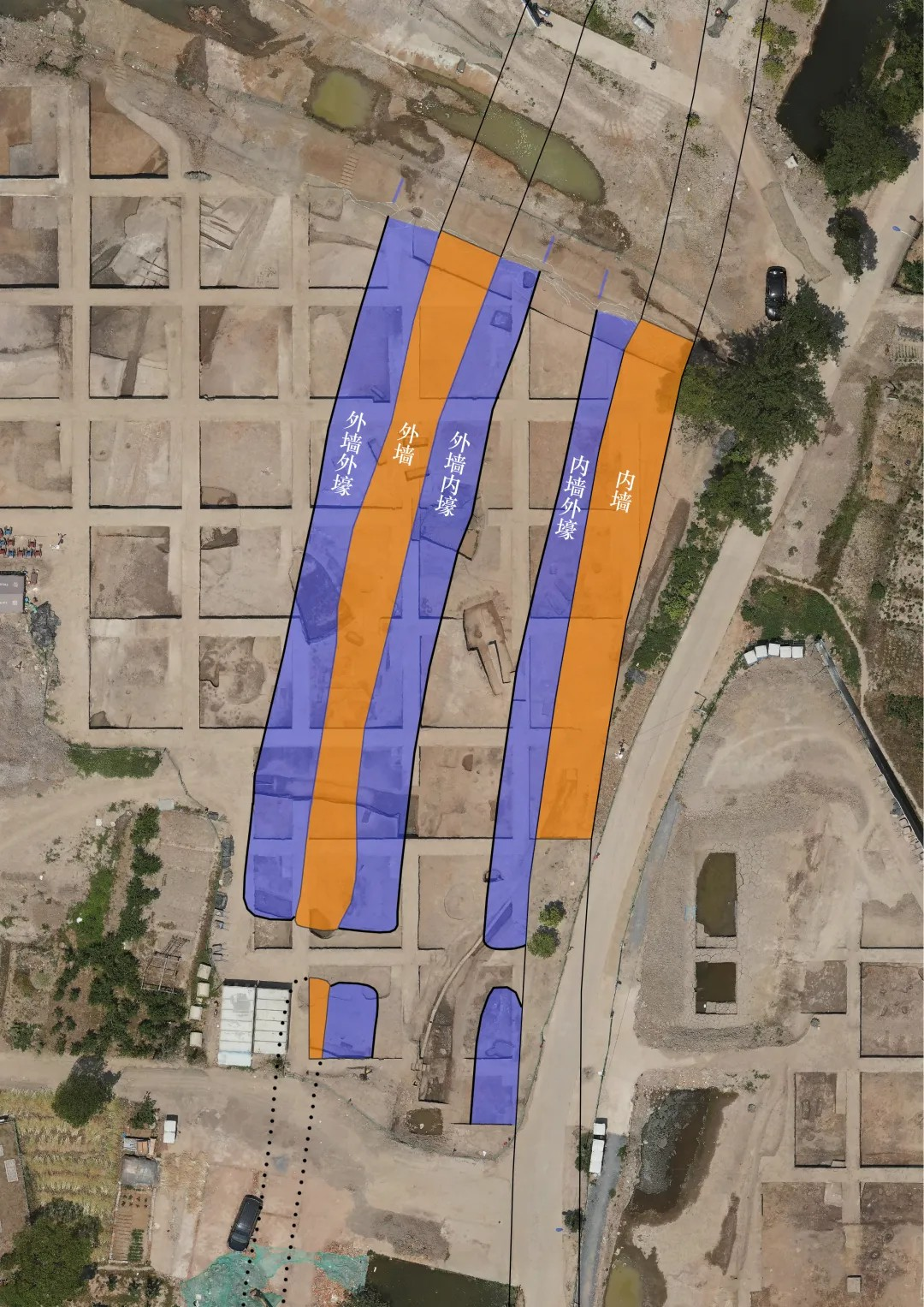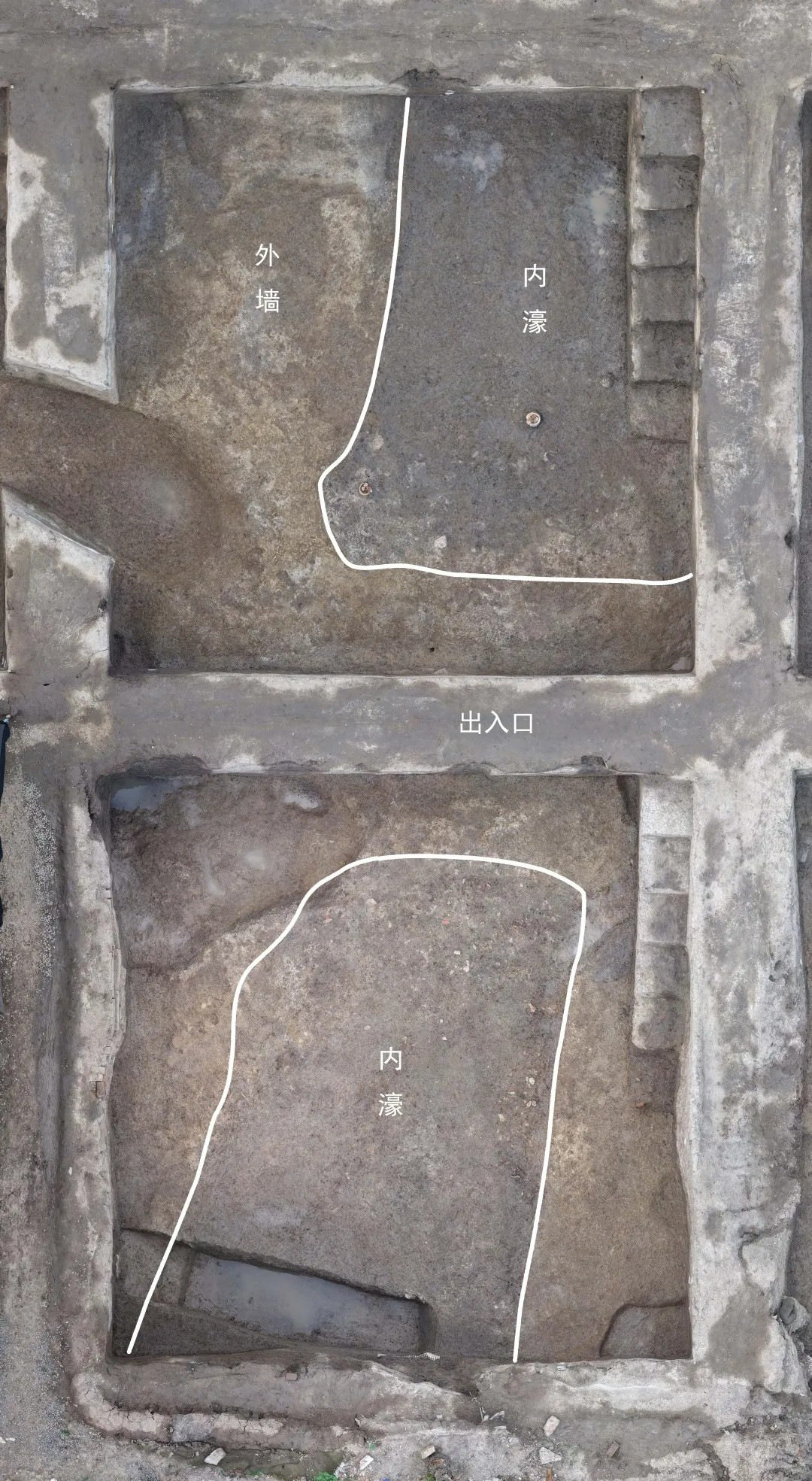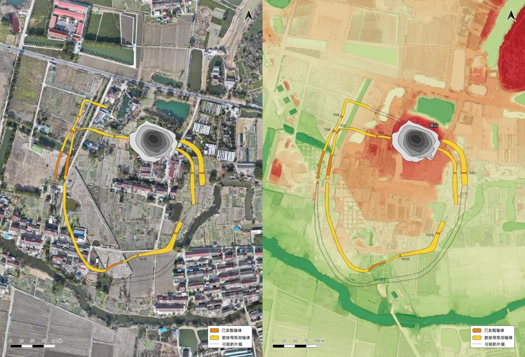 在发掘区西北部,发现并清理了马家浜文化时期的三条壕沟和两道墙体.外墙和壕沟揭示近70米长,内墙和壕沟揭示近50米,初步推测存在史前城址的可能。随即考古队对遗址周边进行重点勘探,追踪墙和壕沟线索,并依据勘探结果先后在遗址西北、北部、东北、东南及南部布设了7条探沟(TG4、TG7、TG8、TG5、TG11、TG12、TG10),均发现有墙和壕沟遗迹。至此,从已有发掘区揭示出的墙和壕沟,结合考古勘探和探沟发掘的情况,可以判断内墙及其外侧壕沟是闭合完整的,平面大致呈圆角方形。如此闭合完整结构的线性遗迹,应是城址。外墙及其外壕主要在遗址北半部,南半部分暂未发现,可能已被破坏,需要继续勘探确认。