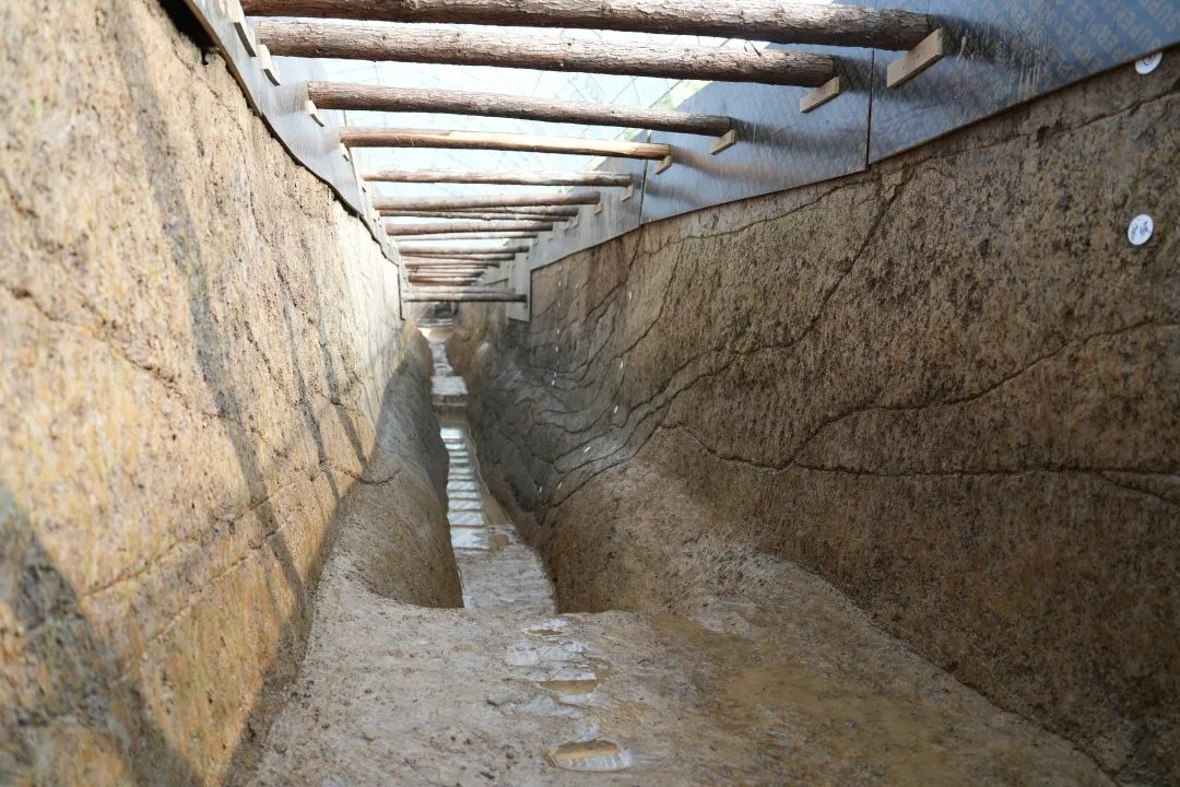 发掘区北部揭示的马家浜文化时期墙体与壕沟(上为北)