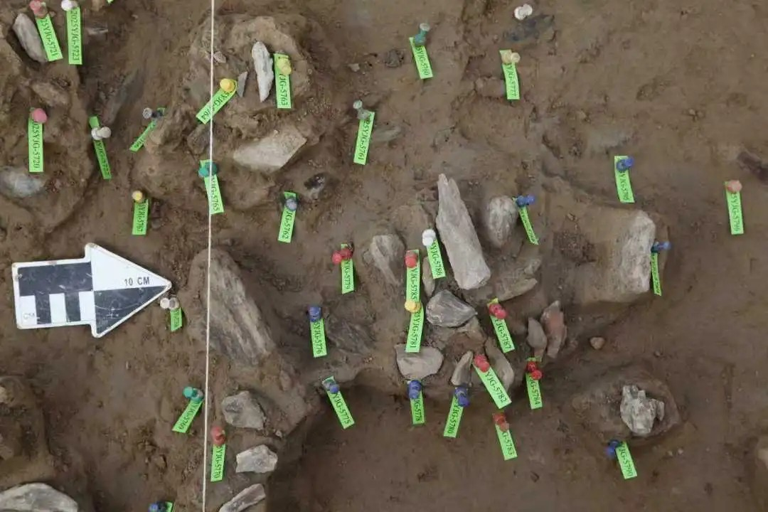 本次发掘严格按照考古发掘规程开展,以发掘区域西南角为基点,以北向为正方向,采用全站仪进行布方和测量工作。探方规格为1米×1 米,文化层发掘面积共约50平方米。发掘时按照文化层内划分水平层的方式逐层向下清理揭露,水平层厚度以5厘米为主。从上到下共清理19个包含遗物的水平层,每一水平层清理完成后使用全站仪记录遗物出土位置,并测量特定遗物的产状信息,使用相机和无人机拍摄遗物出土状态以及分布,并绘制遗物分布图,对发掘的地层进行筛选,以最大程度获取文化遗物。本次发掘共揭露文化层厚度约2米,出土编号标本3355件。