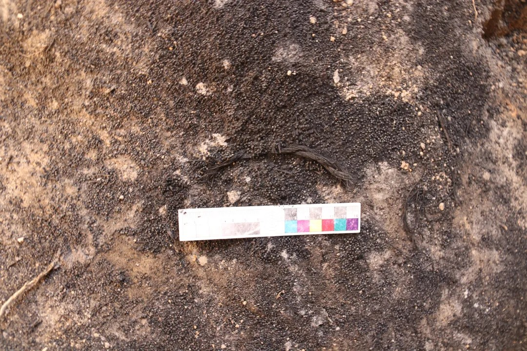 遗址内还发现有5条墙基遗迹,均位于遗址中部,主体呈东西走向,局部存在南北向的转折。墙基残存长度在4.42-29.64米不等,宽0.80-1.22米。墙基解剖结构显示,部分区段底部铺垫有大小不一的石块作为基础,墙基两侧还发现有夯筑墙体时固定夹木遗留的沟槽痕迹。