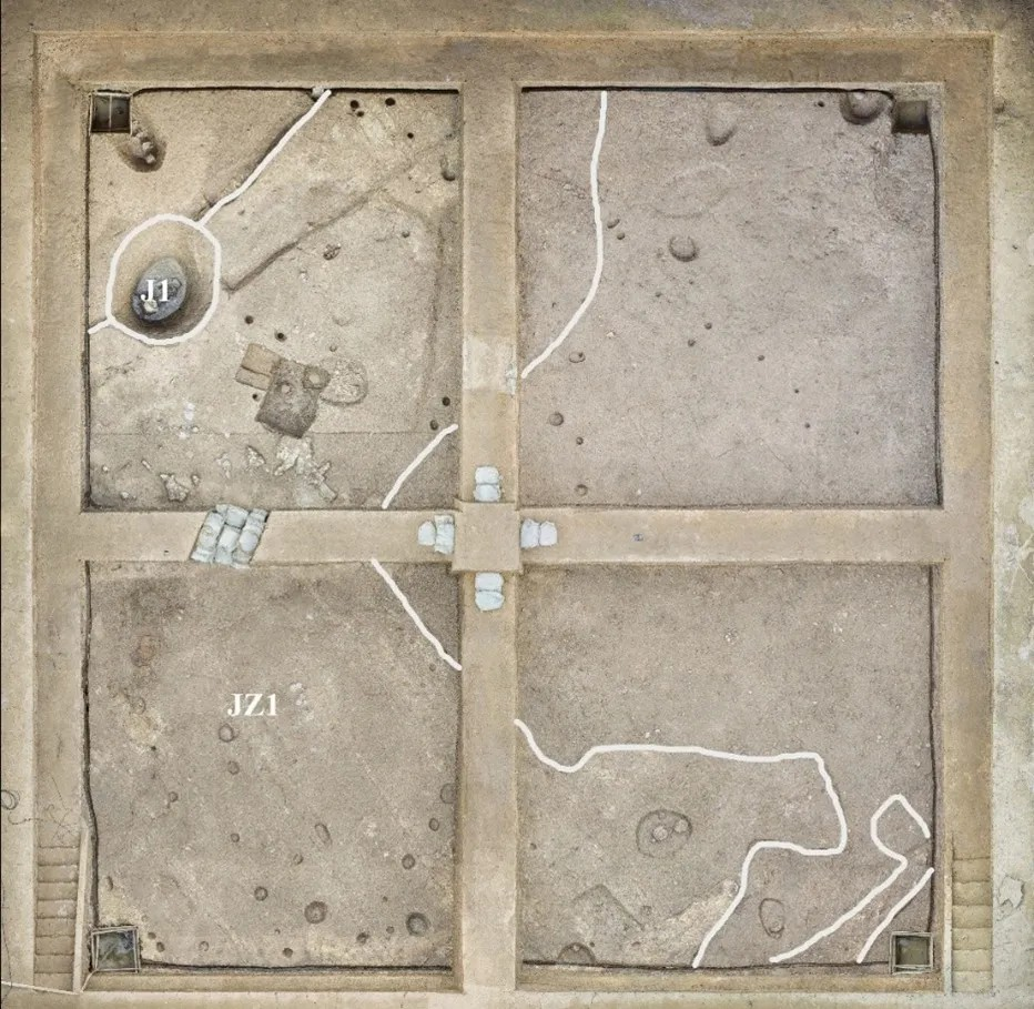 在发掘深度约2.15米的层位下,考古队揭露出一处平面略呈“凹”字形的大型台基式建筑基址JZ1。JZ1仅存垫土台基,台基上建筑已被破坏,对其形制结构判断主要依据膏泥和灰砂的分布范围。基址大致呈东北—西南向,凹口朝向为东北方,方向为52°。平面上发现有40个尺寸、形状各异的柱洞,8个柱坑,其中7个呈圆角方形或圆角长方形,还有一个为不规则形,排列组合规律均待研究;JZ1有两条东北—西南走向的沙沟槽,主体部分还有三条西北—东南走向的沟槽,基本平行,长短不一,可能为地梁;在JZ1的西部有一处灶;中部有一面积较大的灰坑,意义不明。