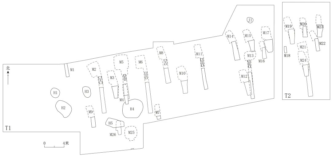 25座唐代墓葬中有2座砖室墓、22座土洞墓、1座竖穴土坑墓和1座因只发掘墓道部分形制不详的墓葬。M5和M25两座砖室墓应均为斜坡墓道单天井单洞室墓。22座土洞墓中M2、M6、M8、M11和M13等5座墓葬为斜坡墓道单天井单土洞室墓;M7、M9、M14、M22等4座墓葬为斜坡墓道单土洞室墓;M3、M4、M10、M12、M15、M16、M17、M19、M20、M21、M23、M24、M26等13座墓葬为竖井式墓道单土洞室墓。M18为竖穴土坑墓。