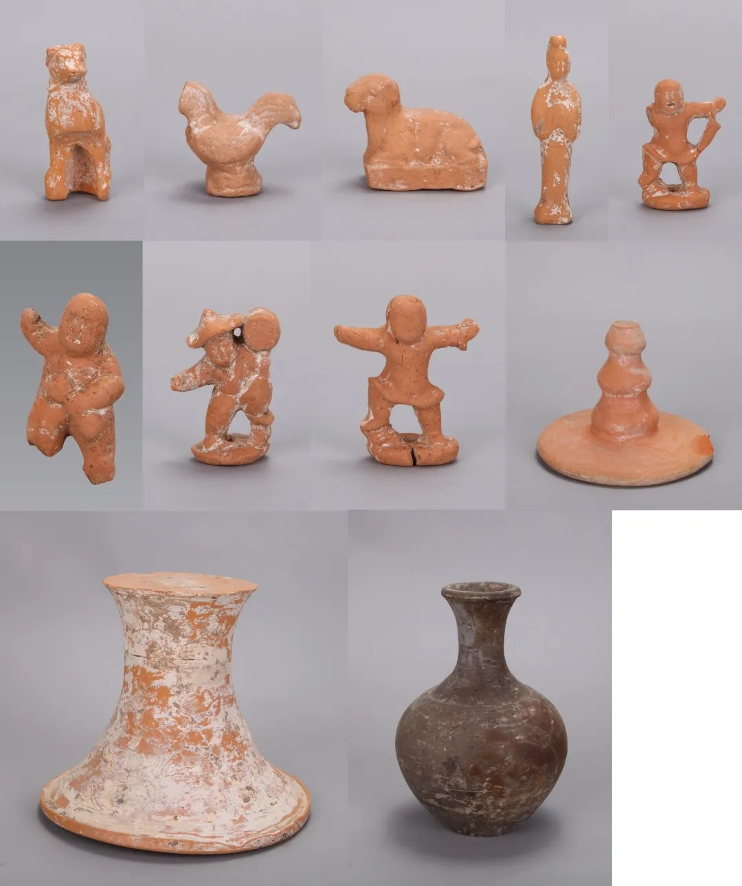 该墓共出土器物19件,有铜镜1件、开元通宝1枚、残铜饰1件、陶动物俑4件、陶人物俑7件、陶瓶1件、陶塔式罐底座和盖各2件。