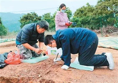 不久前,张旭(右一)在福建福州牛头山考古遗址现场清理并提取古代人类骨骼。 张旭供图