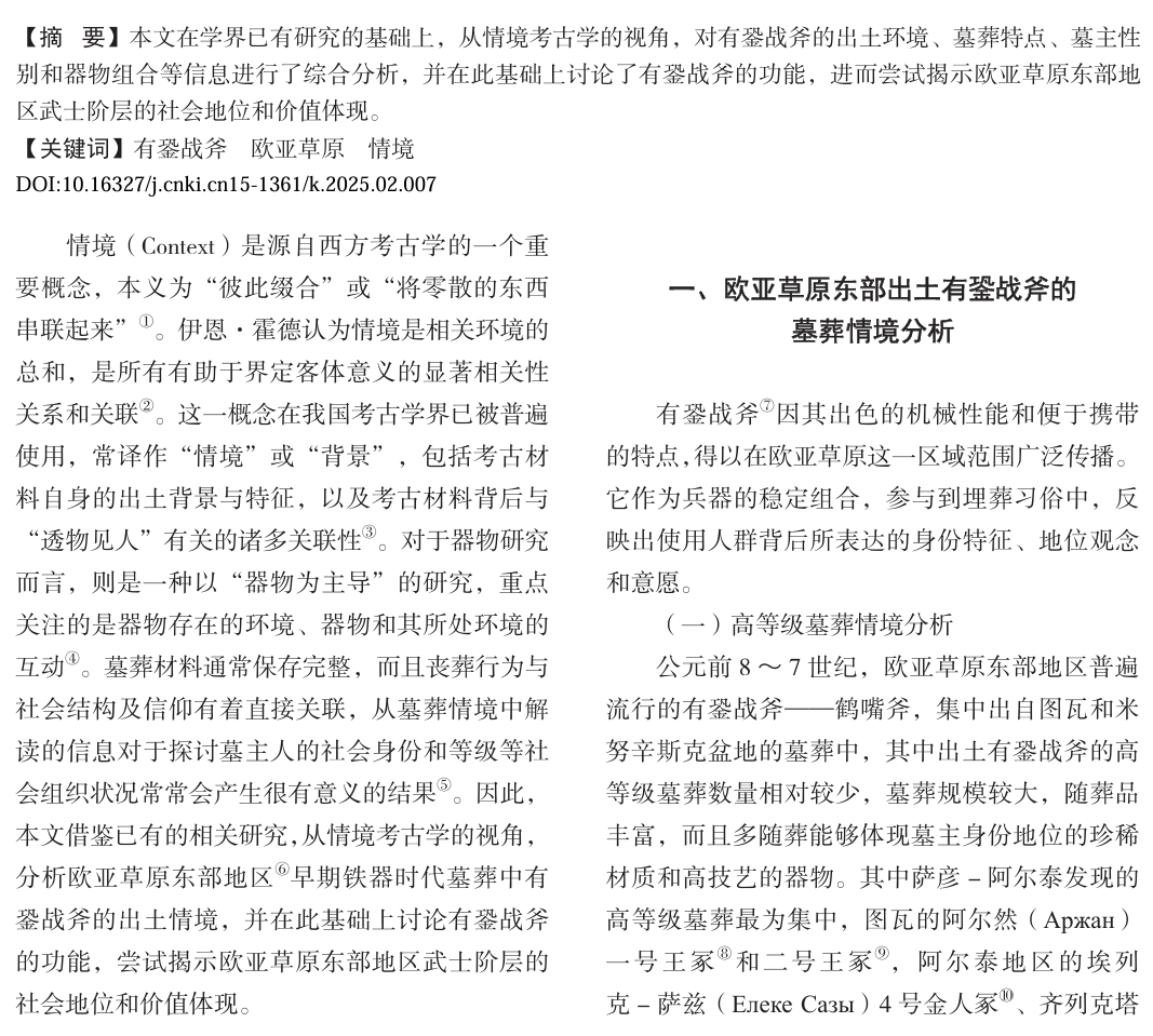 欧亚草原东部地区有銎战斧的功能及相关问题研究——从公元前1千纪草原武士墓葬的情境分析出发