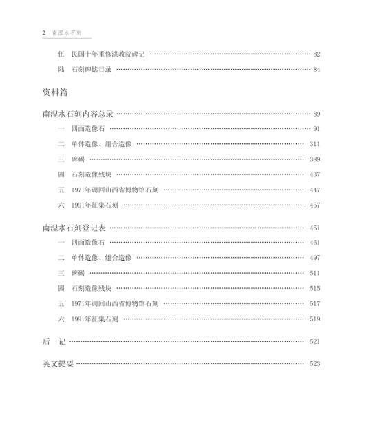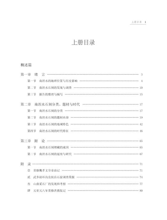 上册为概述篇和资料篇。概述篇简要介绍南涅水石刻的历史背景、石刻的题材内容与时代特征,使读者一览南涅水石刻全貌。资料篇包括南涅水石刻内容总录和统计表。资料篇依照面造像石、单体造像、组合造像、碑碣、石刻造像残块等分述,内容包括编号、尺寸、时代、造像简介、铭文拓片、部分实测图等。统计表包括石刻造像的长、宽、高等基本尺寸,主尊造像高度,典型特征,时代判断等内容,方便检索。